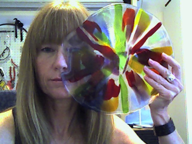 Snapshot_20130724_14Hey Cube’sters!  Here’s an experimental piece I made using a fairly new technique from http://www.fusedglass.org called Kiln Pressed Glass. The goals are:  1)  to have the colors stacked without letting them mix up, 2) to have them spread like watercolors and, 3) all this without the piece becoming thick.  The light refraction is beautiful, like a kaleidoscope!  I’m such a metal head and any color not metal related doesn’t come naturally to me.  So, of course, I gotta master it, right?  🙂  This one took two full fuse firings up to 1500°F and held for – wait for it, ‘cuz I had to – one and a half hours!  The annealing (holding at app. 900 degrees to ensure stability/longevity of the piece) took two full hours.  The indention around my nose occurred because I didn’t plan my glass volume carefully enough on the 2nd run: the glass flowed around the fiber blanket squares used as a vertical spacer UNDER the kiln shelf which was on TOP of the glass which had a metric ton (well, not literally, but almost) of other kiln posts, bricks, shelves, etc on top of that; hence the “press” in the title. Plenty nerve-wracking.  Sorry I don’t have photos of the stack; maybe next time. The first firing looked like this after I opened the kiln and removed all the weights that were stacked on top:
